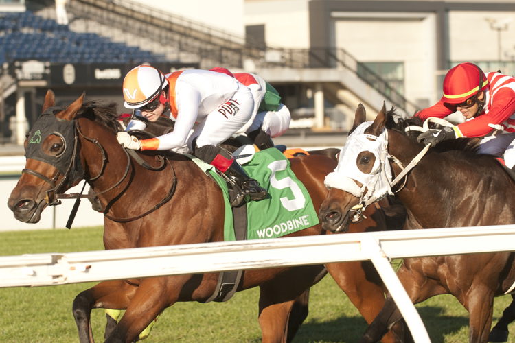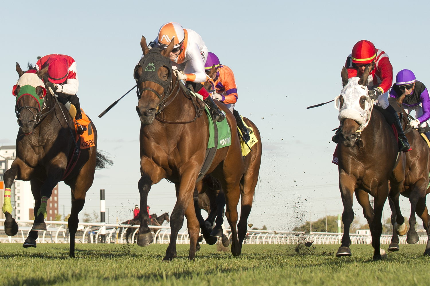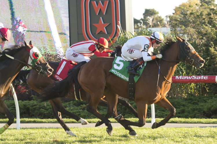 TORONTO, October 26, 2025 – Rapid Test, under Austin Adams, wore down a game rival and fended off the challenge of another foe to win the $100,000 Overskate Stakes, for Ontario-sired 3-year-olds and up, Sunday at Woodbine.