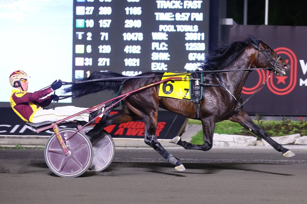 Djimon got rolling around the final turn but spun evenly off three-quarters in 1:26 to create a seam for Warrawee Yang in the lane. And with confusion from hooked wheels between Passarino and Djimon, Warrawee Yang and Hasty Bid were left to duel through the lane clear of pylon-sitter What An Angel in third. Warrawee Yang breezed by Hasty Bid in the last eighth to slide to a two-length victory in 1:53.3 with What An Angel third, Ghostly Casper closing for fourth and Djimon holding fifth.