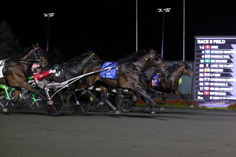 Apex nudged to a narrow lead in the stretch before levelling in an all-out duel against Mr Big Spender. Bartlett meanwhile sent Spencer Hanover off cover and gathered momentum while drifting to the center of the track. Spencer Hanover reached for the front in the final eighth of a mile and slid past the embroiled duo at the pylons to cross the line first in a 1:53.2 mile. Diabolic Hill followed Spencer Hanover and rallied even wider on the track late to take second, beaten three-quarter lengths, with Mr Big Spender holding onto third and Apex settling for fourth.