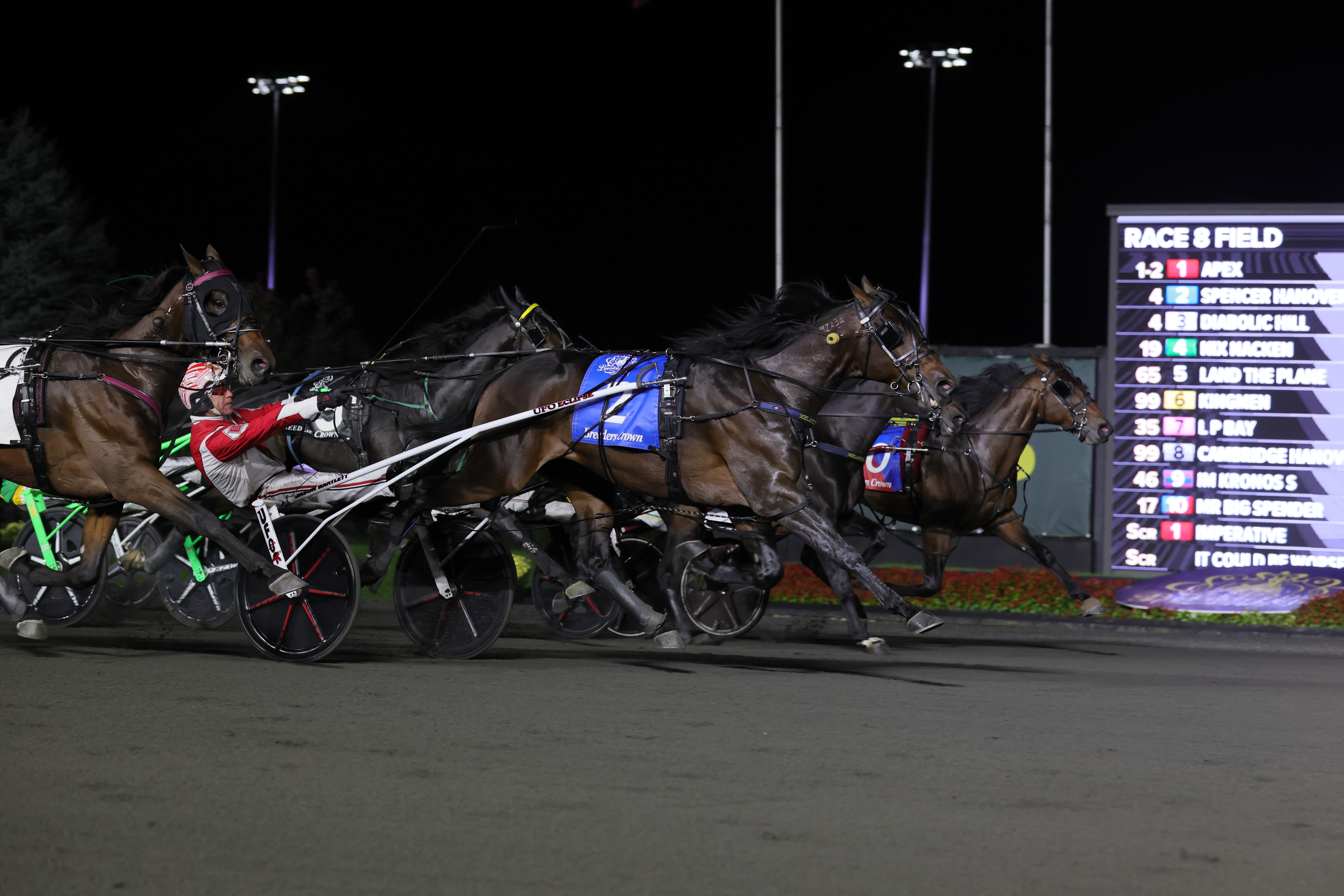 Leaving from post 2, Bartlett slid behind stablemate Apex as the field nestled into order behind post-10 starter Mr Big Spender and Kingmen, who were the only pair to launch off the gate. Mr Big Spender cleared the lead to a :28.4 first quarter and coasted up the backstretch while Apex gradually angled outside from third approaching a :57.4 half. Spencer Hanover followed suit and advanced through the last turn perched behind Apex as he hooked into battle with Mr Big Spender passing three-quarters in 1:25.