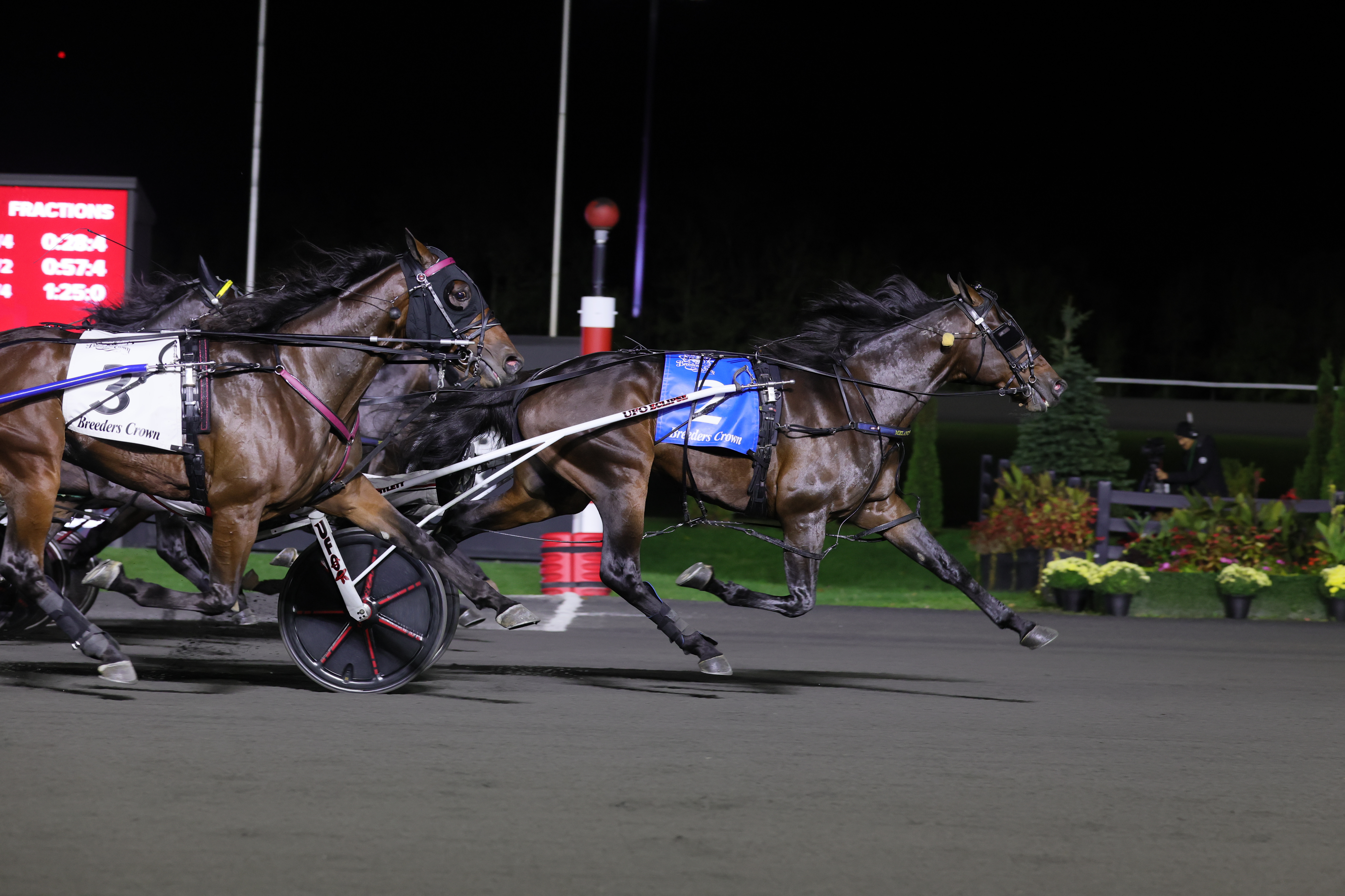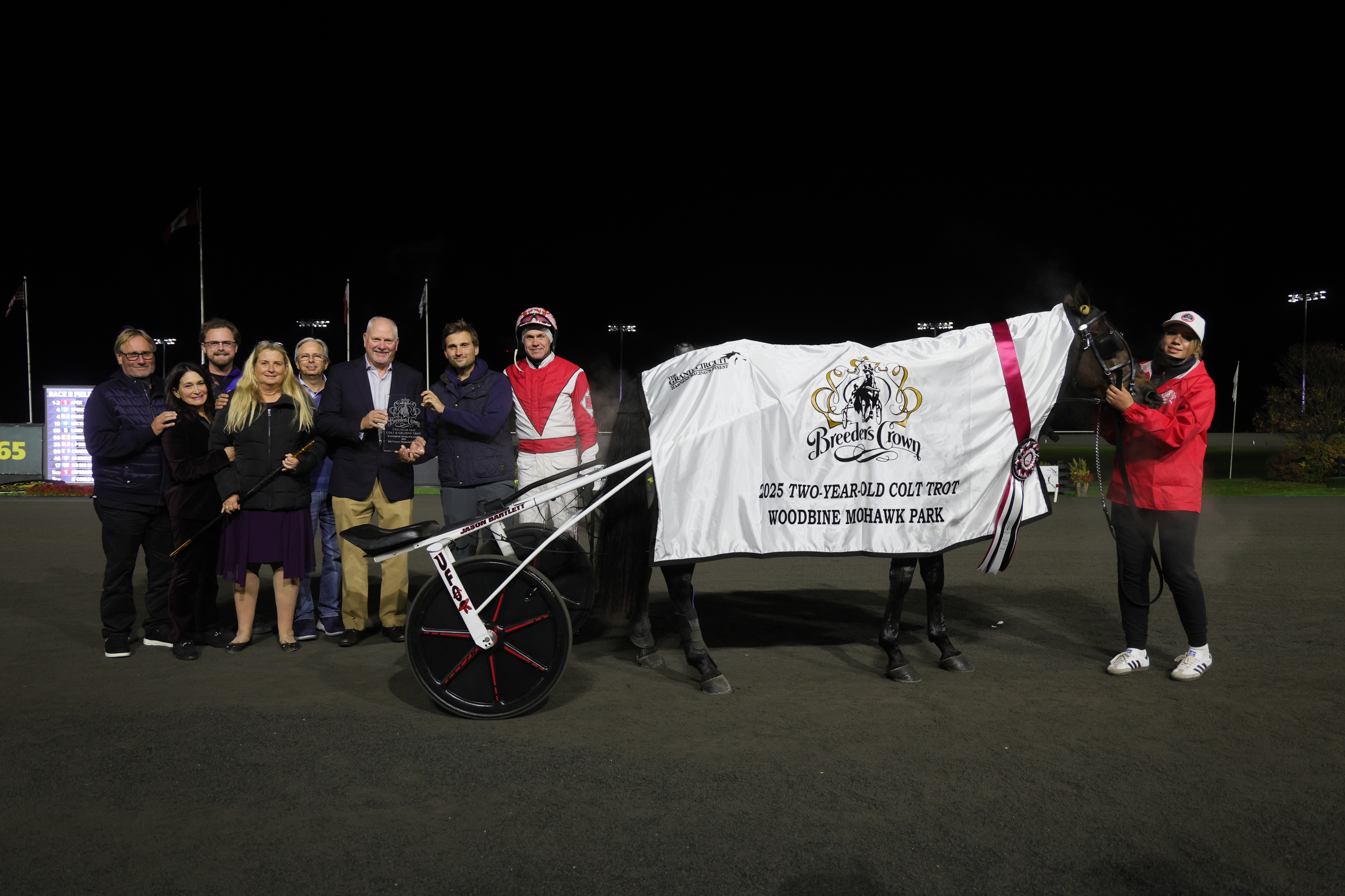 MILTON, October 24, 2025— Elimination winner Spencer Hanover worked another second-over trip and never relented in a four-prong stretch battle to snatch victory with a closing-stride swoop in the $959,000 (CAD) Breeders Crown 2-Year-Old Colt and Gelding Trot final on Friday night at Woodbine Mohawk Park, giving trainer Marcus Melander back-to-back winners in the event and driver Jason Bartlett his first Breeders Crown trophy.