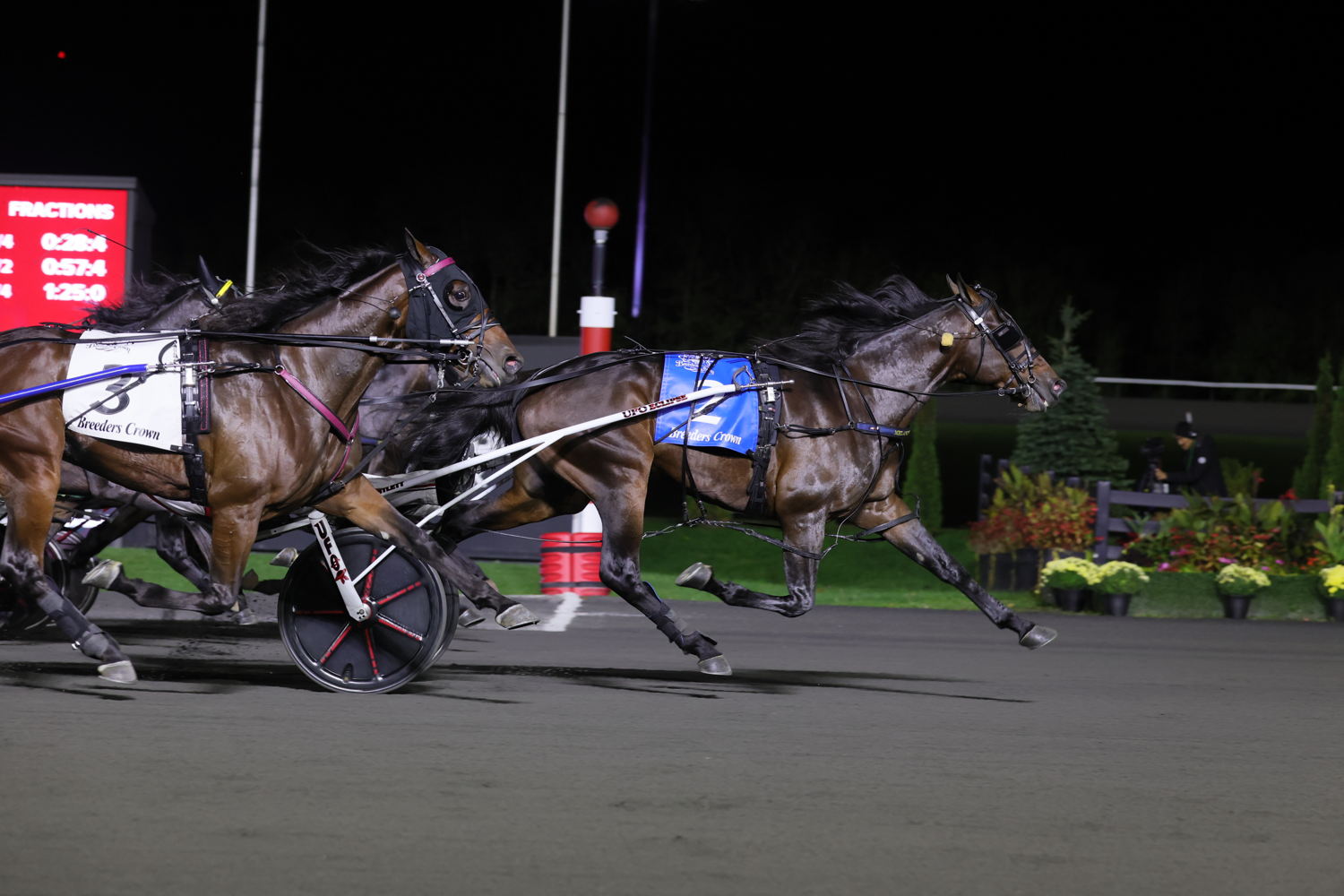 Winning his third race from 12 starts, Spencer Hanover has now banked $758,743 for owners Jeff Snyder, a four-time Breeders Crown winner, and Arthur Pronti, who won his first Breeders Crown trophy. Hanover Shoe Farms Inc. bred the Chapter Seven-Secret Passion colt and continues to lead all breeders in the championship series with 34 trophies earned.