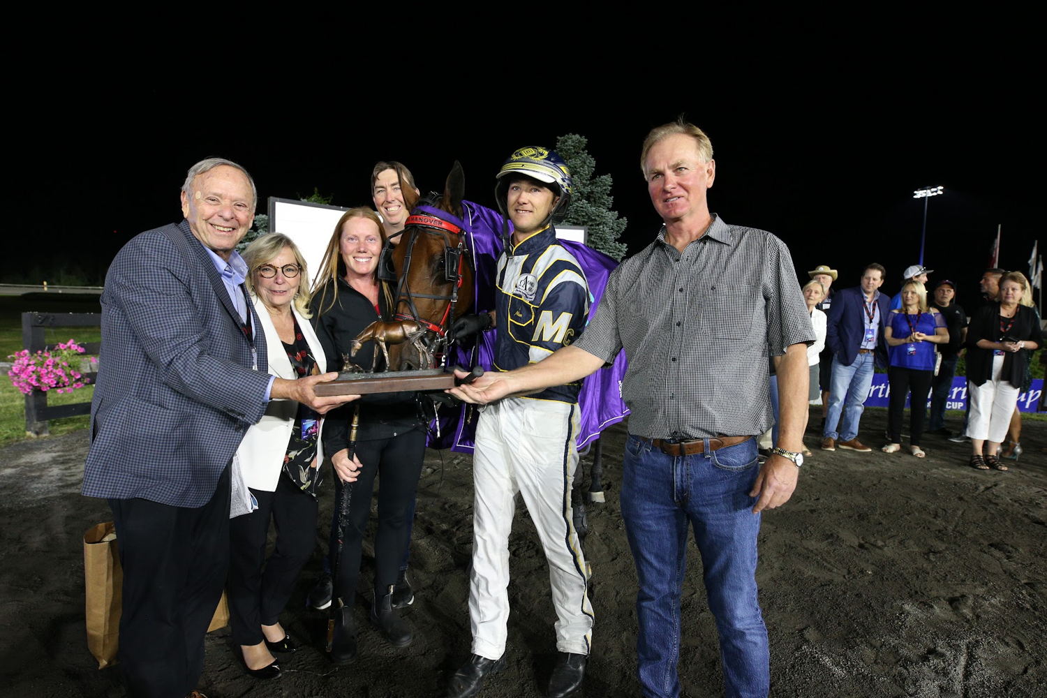 Introduced in 1983, The Fan Hanover Stake is named in honour of the pacing filly who accomplished what no other sophomore distaffer has done before or since – win the Little Brown Jug. Owned by the Dr. Glen Brown, who passed away last year, and trained and driven by Glen Garnsey, the Albatross miss defeated her male rivals in the 1981 edition of the coveted race. Dr. Brown’s granddaughter, Jenna Hague, was on hand tonight to make the trophy presentation following in her grandfather’s tradition.